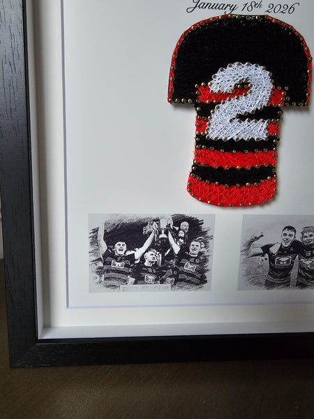 A truly unique gift for any player. The stringart jersey includes the players number (he or she wore) on the big day. Also included is a sketch photo of him/her in action or lifting the cup!