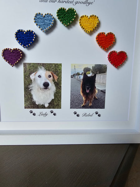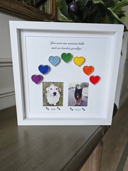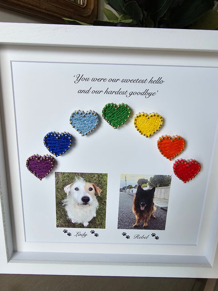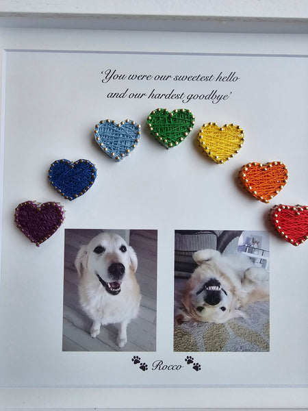 Designed to celebrate a life filled with love, the frame features cherished photos of your dog displayed beneath a beautiful love-heart shaped string-art rainbow, symbolising the everlasting bond you share.